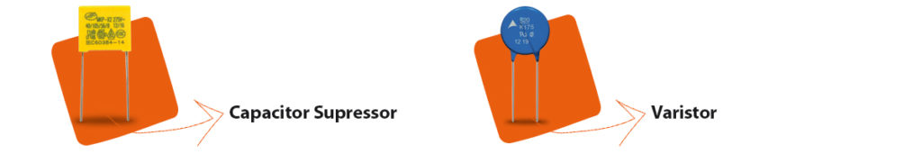 - Proteção contra interferências de RF (radiofrequência) via rede elétrica: é a função básica de um filtro de linha. Estas interferências são causadas por reatores eletrônicos, alguns tipos de luminárias LED, motores elétricos, transmissores de rádio e outros equipamentos. Elas afetam o funcionamento de aparelhos eletroeletrônicos, causando mau funcionamento. Esta função é proporcionada geralmente por capacitores supressores, como o exemplo ilustrado abaixo.