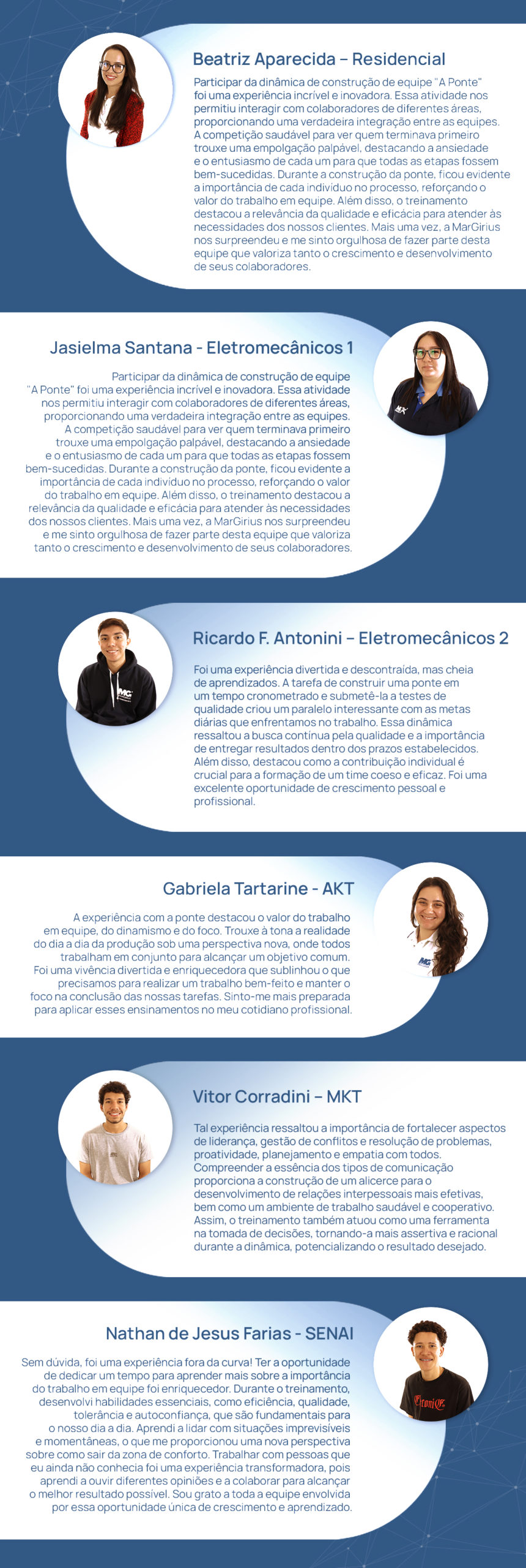 Esses relatos evidenciam o impacto positivo da experiência, destacando o aprimoramento das habilidades interpessoais e a força do trabalho em equipe, que são fundamentais para o nosso crescimento coletivo.